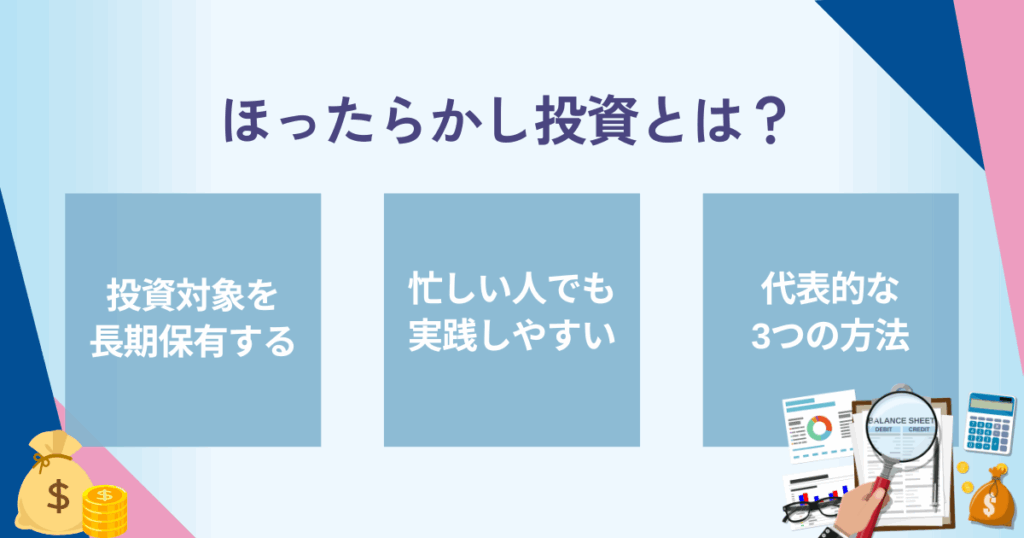 ほったらかし投資とは、「投資対象を長期保有し、資産の増加を目指す投資スタイル」のことだ。
