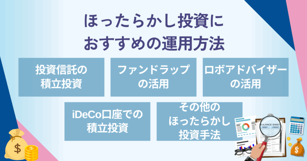 ほったらかし投資の実践方法は、投資信託の積立やファンドラップ、ロボアドバイザーの活用などさまざまだ。