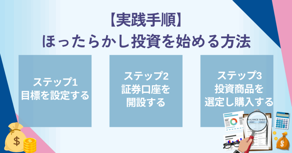 最後に、実際にほったらかし投資を始めるための基本的なフローを紹介する。自分の投資スタンスに合わせてステップを調整して欲しい。
