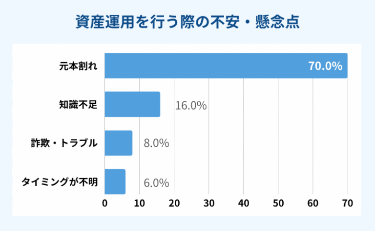 事実、前述の調査において、資産運用の不安として「元本割れ」に次いで多かったのが「知識不足」(16.0%)でした。