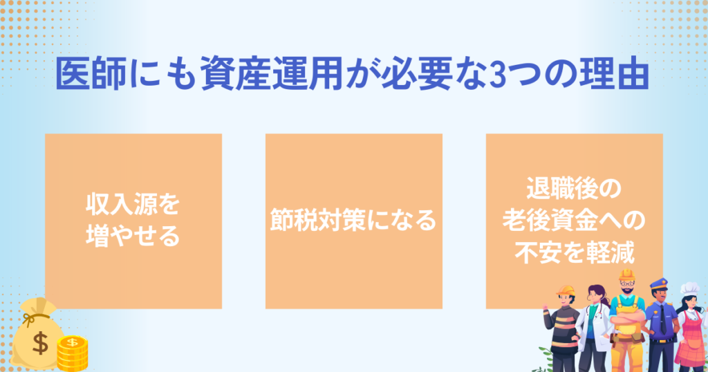 収入源の増加や節税対策、退職後の不安軽減など、様々な理由から医師にも資産運用が必要だ。