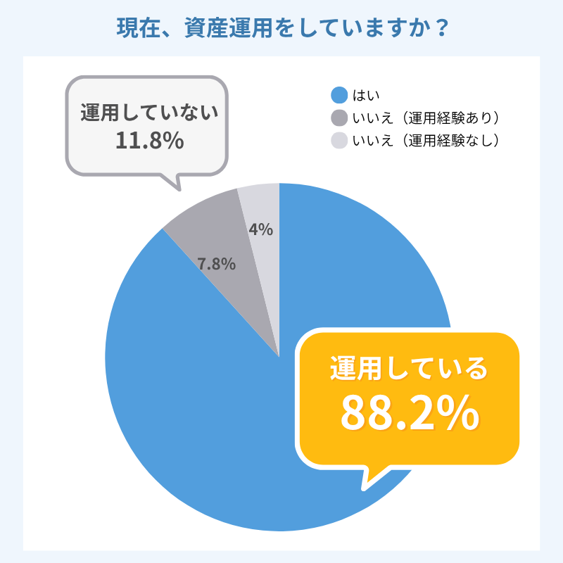 弊社が実施した「50代の資産運用実態に関する調査」によると、50代で現在資産運用を行っている人は88.2%にのぼり、過去の経験者を含めると9割以上が資産運用の経験があることがわかった。