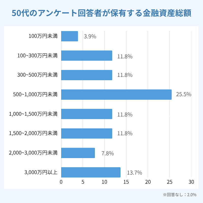 ちなみに、前述の調査では、保有する金融資産総額で最も多かった回答は「500~1,000万円未満」(25.5%)だった。
