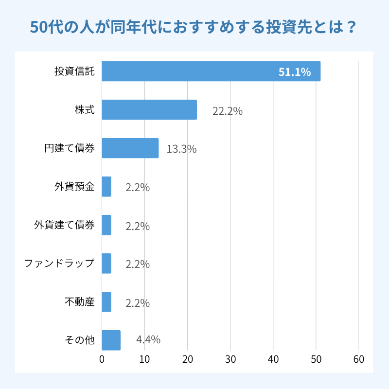 弊社の調査で「同年代におすすめの投資先」を尋ねたところ、過半数の51.1%が「投資信託」と回答し、2位の「株式」(22.2%)に大差をつける結果となった。