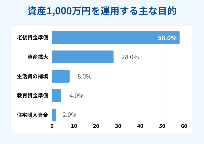 弊社が行った「資産1,000万円の運用実態に関する調査」によると、運用の主な目的として最も多かった回答は「老後資金準備」(58.0%)であり、次いで「資産拡大」(28.0%)であった。