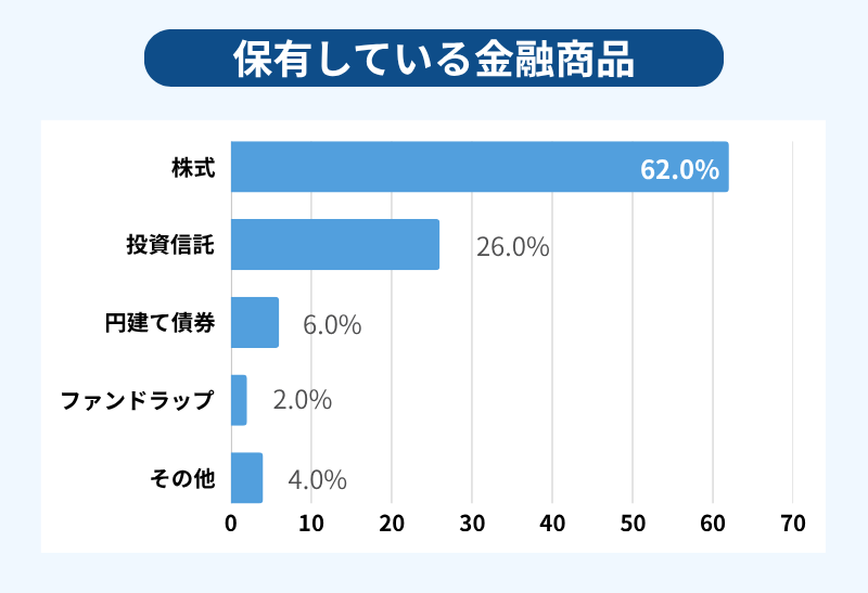 前述の調査では、運用している金融商品として「株式」が62.0%と過半数を占め、次いで「投資信託」が26.0%であった。この2商品で全体の9割近くを占めており、資産形成の中核となっている実態がうかがえる。