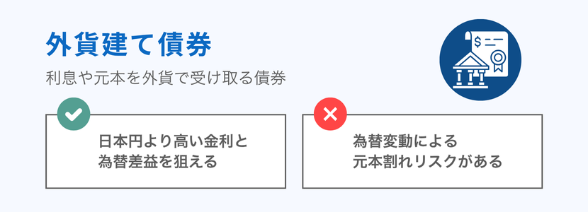 | 日本の債券より金利が高い傾向にある 円安になれば為替差益も得られる 資産を円以外の通貨に分散できる | 為替変動リスクがある(円高で損失) 為替手数料のコストがかかる 発行体の情報が手に入りにくい場合がある 発行体の信用リスク(デフォルトリスク)がある |