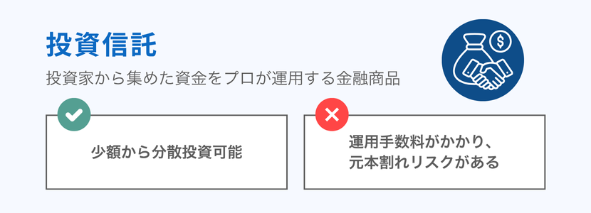 | 数百円といった少額から手軽に分散投資ができる 運用のプロであるファンドマネージャーに銘柄選定・管理を任せられる NISAやiDeCoで運用できる | 運用期間中に手数料や費用がかかる 相場の状況や運用状況によっては損失が生じる可能性がある |