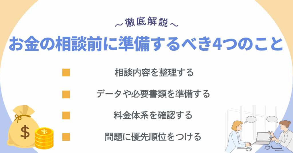 お金の相談をスムーズに進めるためには、事前の準備が欠かせない。ここでは、適切な解決策を得るために行うべき4つの準備項目について解説する。
