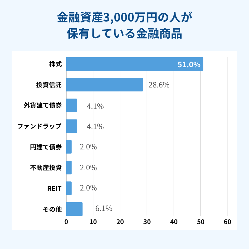 なお、弊社が実施した「資産3,000万円の運用実態に関する調査」では、保有金融商品の内訳として、株式が51.0%、投資信託が28.6%と、両者で大部分を占めていました。