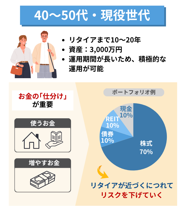 たとえば、退職金3,000万円を受け取った60代の方には安定重視のポートフォリオを、40代で追加投資の余力がある方には成長重視のポートフォリオを、といった形で個別の状況に合わせた提案が受けられます。