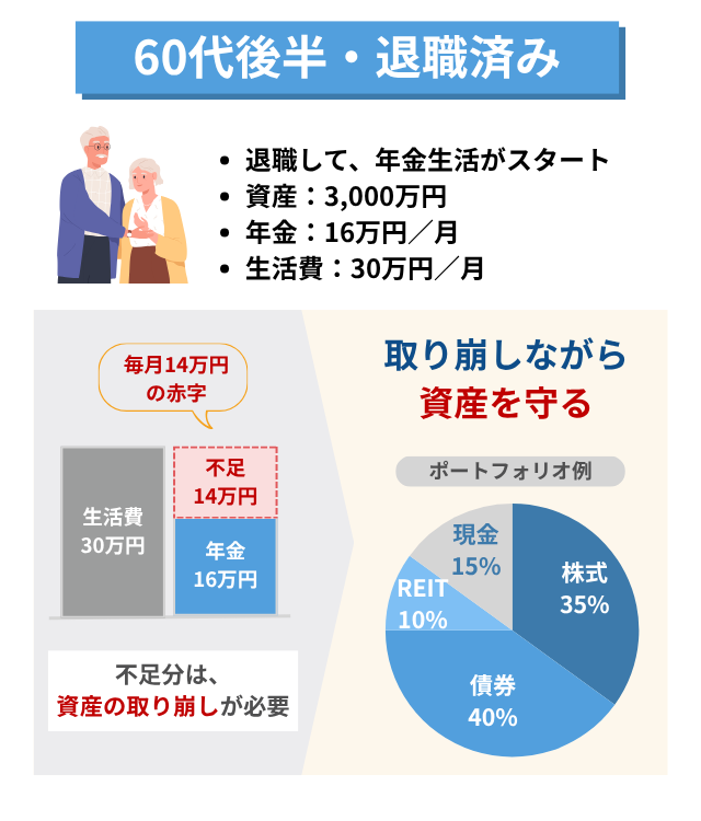 まず、毎月の生活費と年金などの収入を比較し、不足する金額を明確にします。たとえば月30万円の生活費で年金が月15万円なら、月15万円(年間180万円)の不足分を資産から取り崩す必要があります。