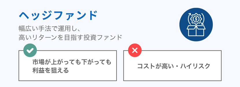 | 市場全体が下落する局面でも利益を追求できる 伝統的資産(株式・債券)と異なる値動きが期待できる 資産全体の安定性向上に寄与する場合がある | 最低投資額が数千万円以上と高額な場合が多い ロックアップ期間(1〜3年など)があり、すぐ解約できない 手数料が高い傾向がある(例:資産の2%+成果報酬20%) |