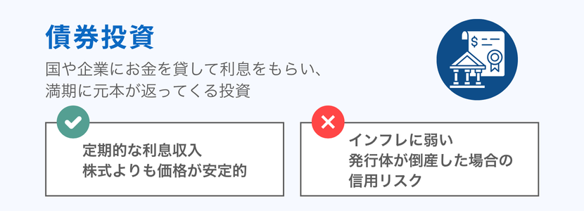 | 株式に比べて値動きが小さい 定期的に利息収入が得られる 満期まで保有すれば元本が戻る(デフォルトがなければ) ポートフォリオの安定性を高める 国債は信用度が高い | 利回りは株式に比べて低い傾向 金利上昇時には債券価格が下落する インフレに弱い(実質価値の目減り) 社債は発行企業の信用リスクがある 外債は為替リスクがある |