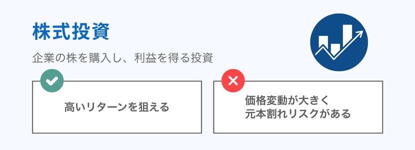 | 長期的な成長が期待できる 配当金という定期収入が得られる可能性がある インフレに強い傾向がある 流動性が高く売買しやすい 新NISA口座なら配当・譲渡益が非課税 | 短期的な値動きが大きい 企業業績によっては損失が発生する 個別銘柄への集中投資はリスクが高い 銘柄選択には一定の知識が必要 海外株式は為替リスクがある |