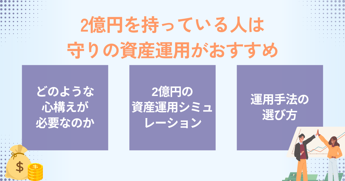 2億円という大規模な資産を運用する場合、積極的に増やすことよりも守りながら堅実に運用することが求められる。