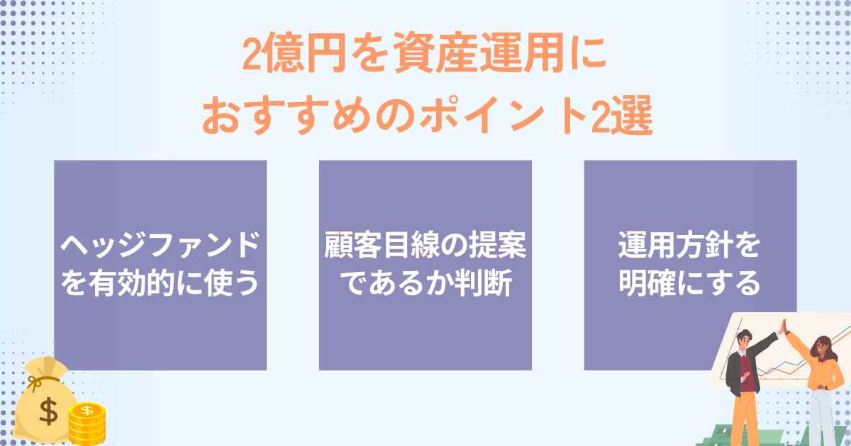 2億円などのまとまった資金を運用する場合に気をつけておくべきポイントは、大きく以下の2つだ。