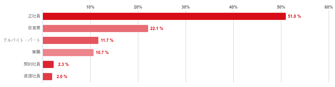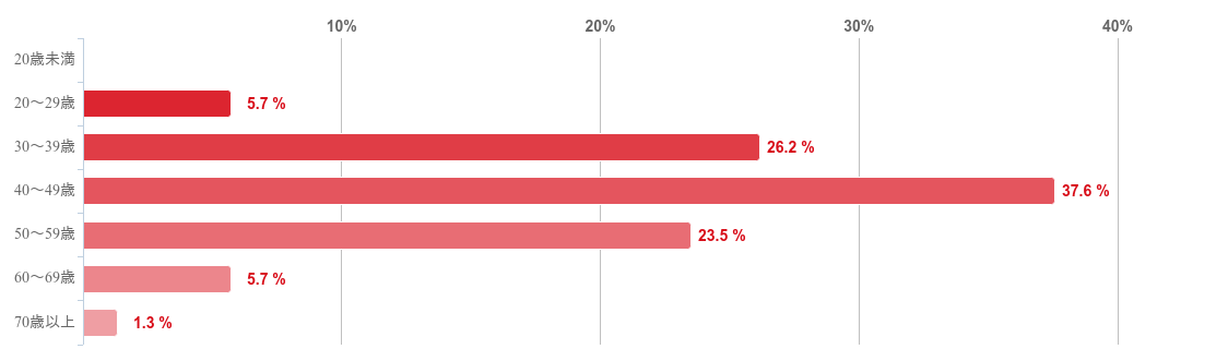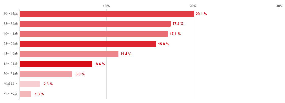 30〜34歳が20.1%と最も多く、35〜39歳が17.4%、40〜44歳が17.1%で続いた。