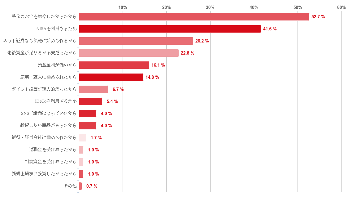 「手元のお金を増やしたかったから」が52.7%で最も多く、「NISAを利用するため」が41.6%でこれに続いた。