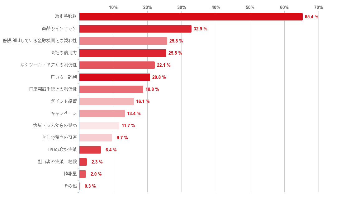 また、複数の証券口座を活用している投資家も一定数おり、口座を選ぶ際は取引手数料や商品ラインナップ、普段利用している金融機関との親和性などを特に重視する傾向が見られた。