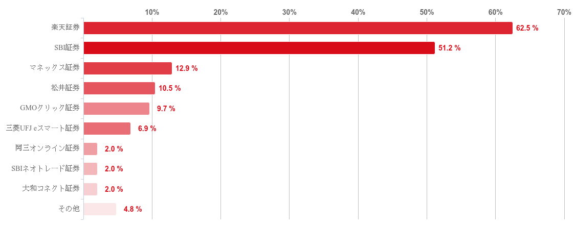 「楽天証券」が最も多く62.5%、「SBI証券」も51.2%でこれに続いた。