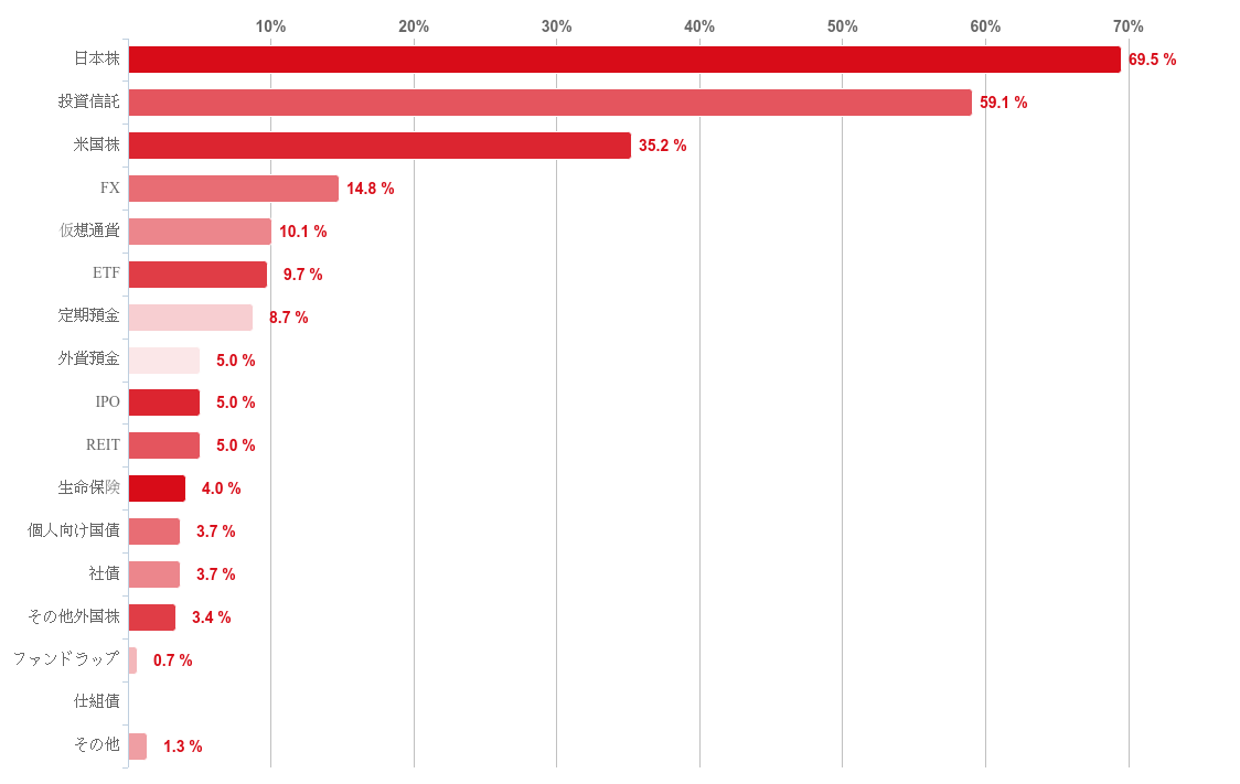 「日本株」が69.5%で最も多く、「投資信託」が59.1%でこれに続いた。