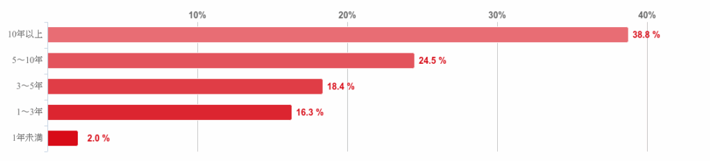 「10年以上」が38.8%と最も多く、「5~10年」(24.5%)「3~5年」(18.4%)と続いた。