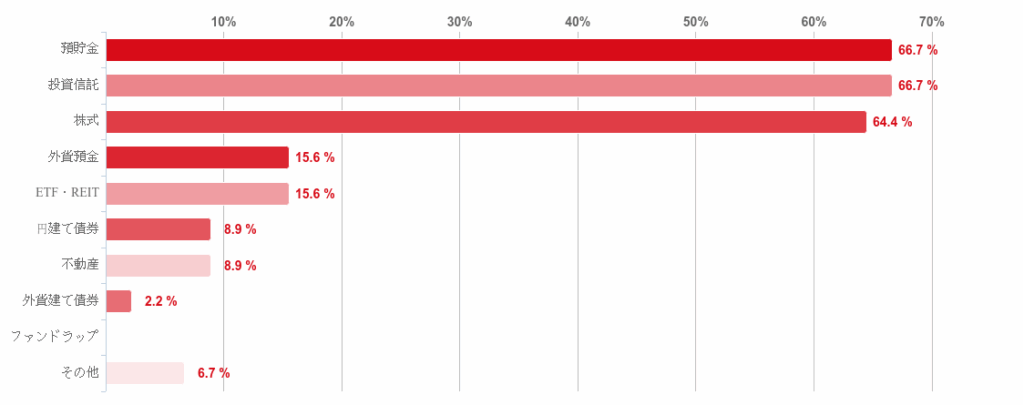 「預貯金」と「投資信託」が66.7%と同率で最も多く、「株式」も64.4%と僅差でこれに続いた。