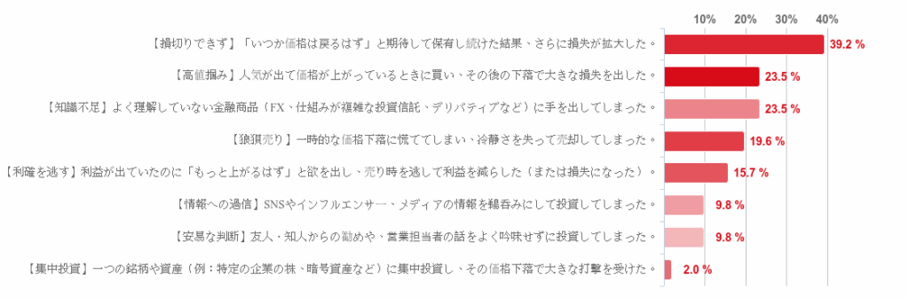 また、「【高値掴み】人気が出て価格が上がっているときに買い、その後の下落で大きな損失を出した」や「【知識不足】よく理解していない商品(FX・仕組みが複雑な投資信託・デリバティブなど)に手を出した」という回答も23.5%と一定数みられた。
