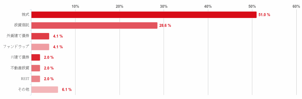 「株式」が51.0%と過半数で最も多く、次いで「投資信託」(28.6%)が2番目に多かった。