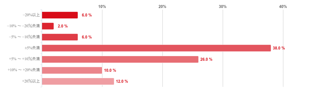 「±5%未満」が38.0%で最も多く、「+5%~+10%未満」が26.0%、「+20%以上」が12.0%と続いた。