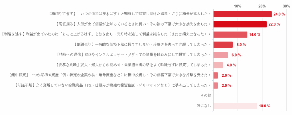 「【損切りできず】「いつか価格はもどるはず」と期待して保有した結果、さらに損失が拡大した」との回答が24.0%で最も多く、「【高値掴み】人気が出て価格が上がっているときに買い、その後の下落で大きな損失を出した」との回答が22.0%と僅差で続いた。