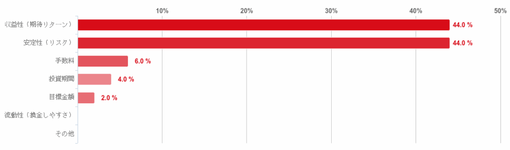 「安定性(リスク)」と「収益性(期待リターン)」が44.0%と同率で最も多かった。