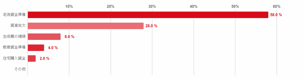 「老後資金準備」が58.0%で約6割となり圧倒的に多かったが、「資産拡大」も28.0%となり、多く回答を集めた。