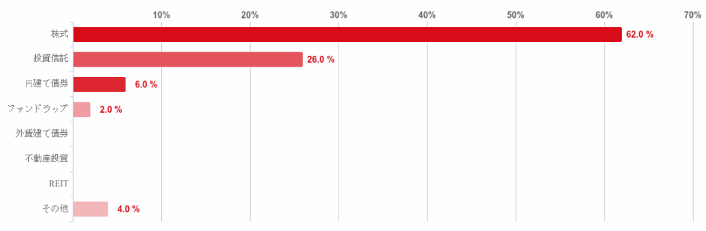「株式」が62.0%と過半数で最も多く、次いで「投資信託」(26.0%)が2番目に多かった。