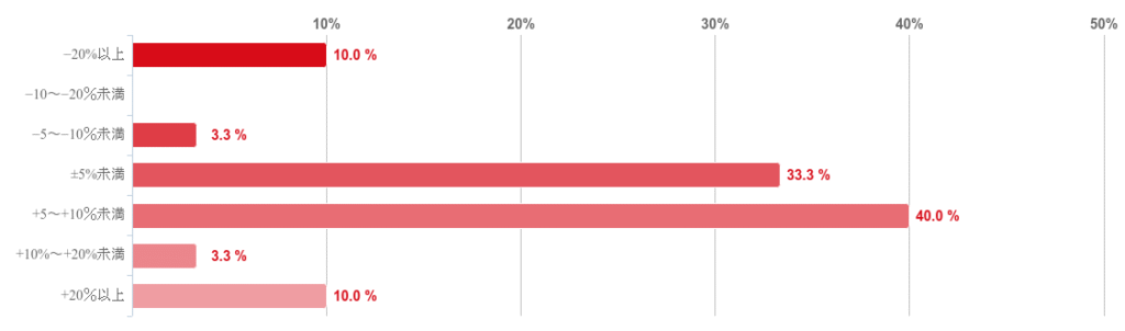 「+5%~+10%未満」が40.0%で最も多く、「±5%未満」が33.3%、「−20%以上」と「+20%以上」が共に10.0%と続いた。