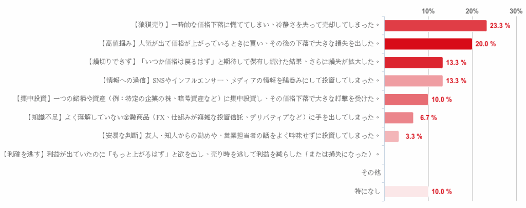 「【狼狽売り】一時的な価格下落に慌ててしまい、冷静さを失って売却した」が最も多く23.3%で、次いで「【高値掴み】人気が出て価格が上がっているときに買い、その後の下落で大きな損失を出した」が20.0%で僅差で続いた。