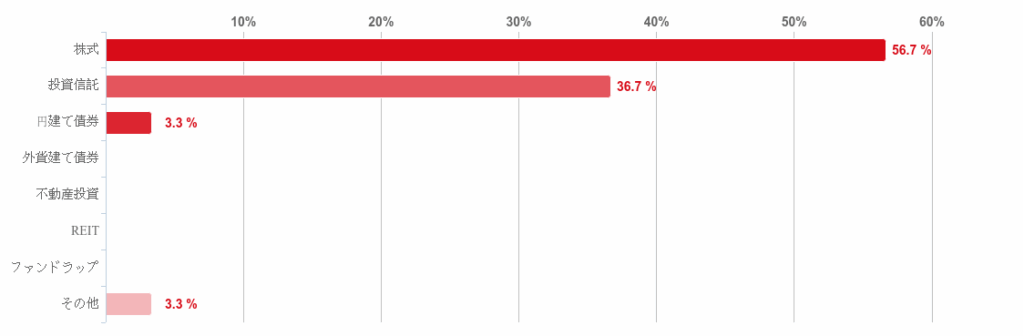 「株式」が56.7%と約6割で最も多く、次いで「投資信託」(36.7%)が2番目に多かった。