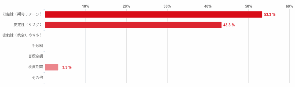 「収益性(期待リターン)」が53.3%で過半数となり、次いで「安定性(リスク)」が43.3%となった。