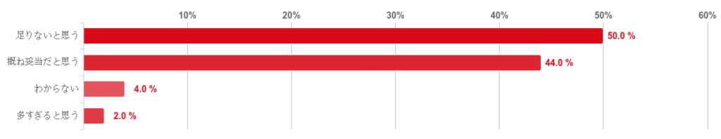 次いで、「概ね妥当だと思う」が44%で約4割を占め、続いて「わからない」(4.0%)、「多すぎると思う」(2.0%)という順となった。