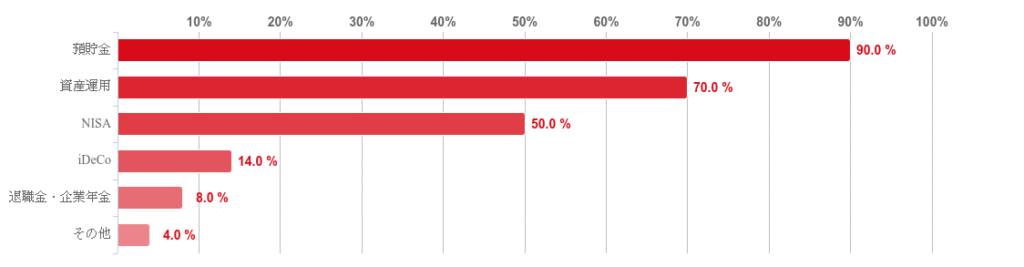 老後資金の準備方法として活用しているものとして、「預貯金」が90.0%、「資産運用」が70.0%、「NISA」が50.0%の回答を集めた。