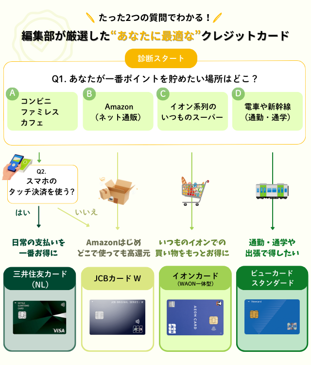 そこでここでは、あなたの使い方で一番得するクレジットカードを見つけるための、2つの簡単な質問を用意した。