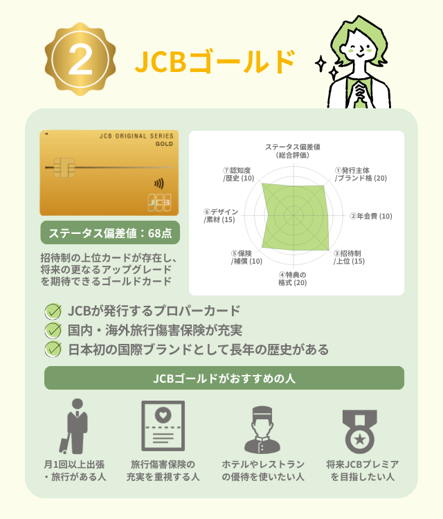 30代で最初のステータスカードを選ぶ場合は、JCBゴールドがおすすめだ。