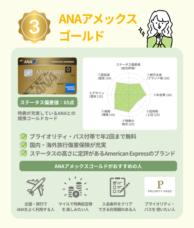 また、ANAアメックスゴールドのように年会費1万円以上のゴールドカードは年会費の支払いが経済力の証明となり、会員層のフィルタリング効果を発揮するだろう。
