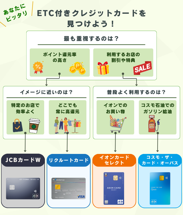 ETCカード選びで迷っているなら、以下のフローチャートを活用して自分に最適な一枚を見つけよう。