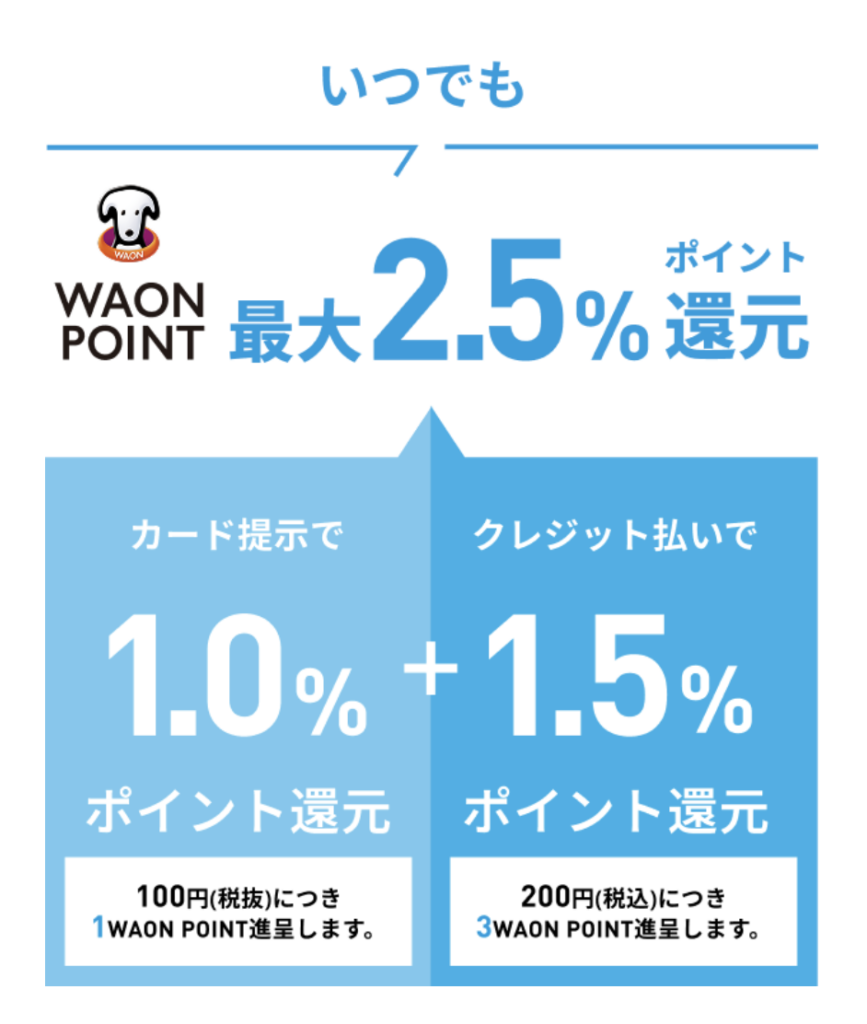 | ポイント・還元率 | もらえるポイント:WAON POINT ポイント換算:200円ごと1ポイント 還元率:0.50%~10.0% |