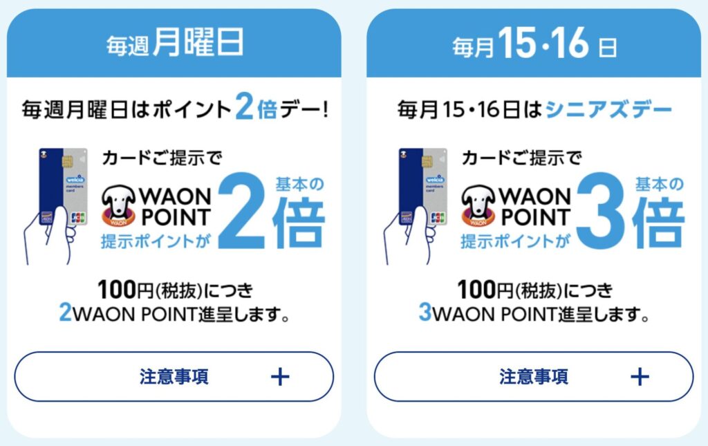 毎週月曜日は「ポイント2倍デー」となっており、カードを提示するとポイント還元率が2倍になる。