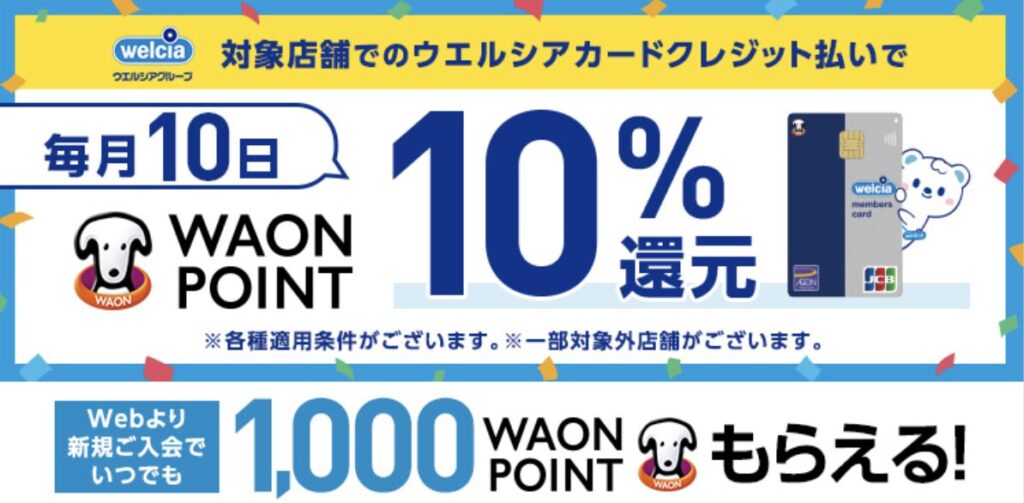 ウエルシアカードを使用してウエルシアグループの対象店舗で買い物をすると、毎月10日にWAON POINTの還元率が最大で11%となる。
