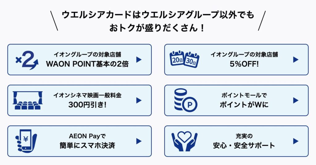 ウエルシア系列店舗で効率よくポイントを貯められ、またイオン系列店舗やイオンシネマをお得に利用できるメリットがある。