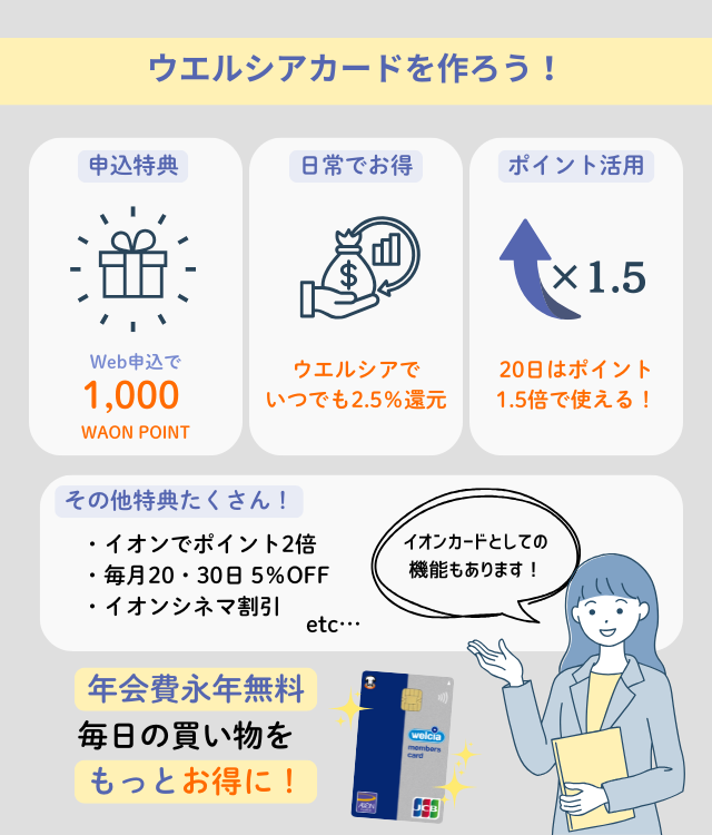 年会費が無料でありながらも、イオン系列店舗やウエルシアでお得に買い物ができる。
